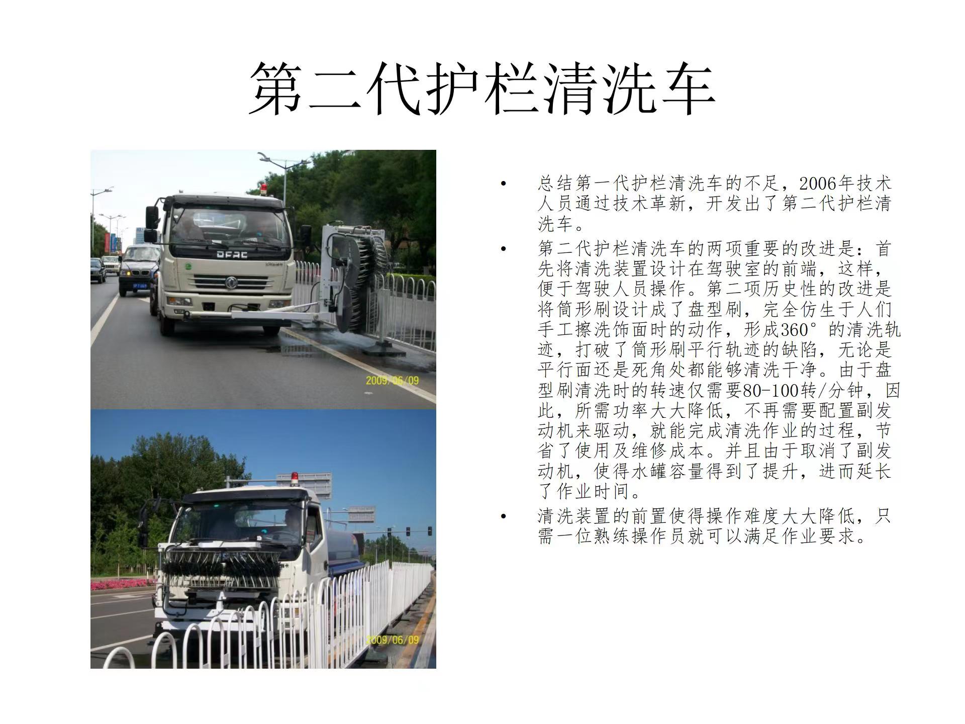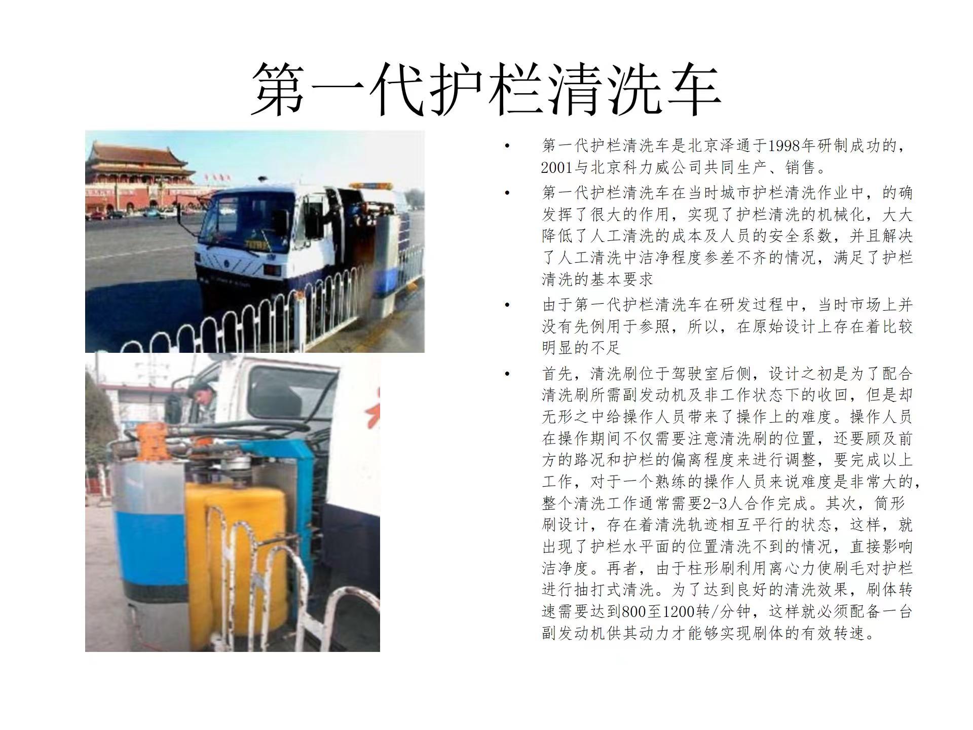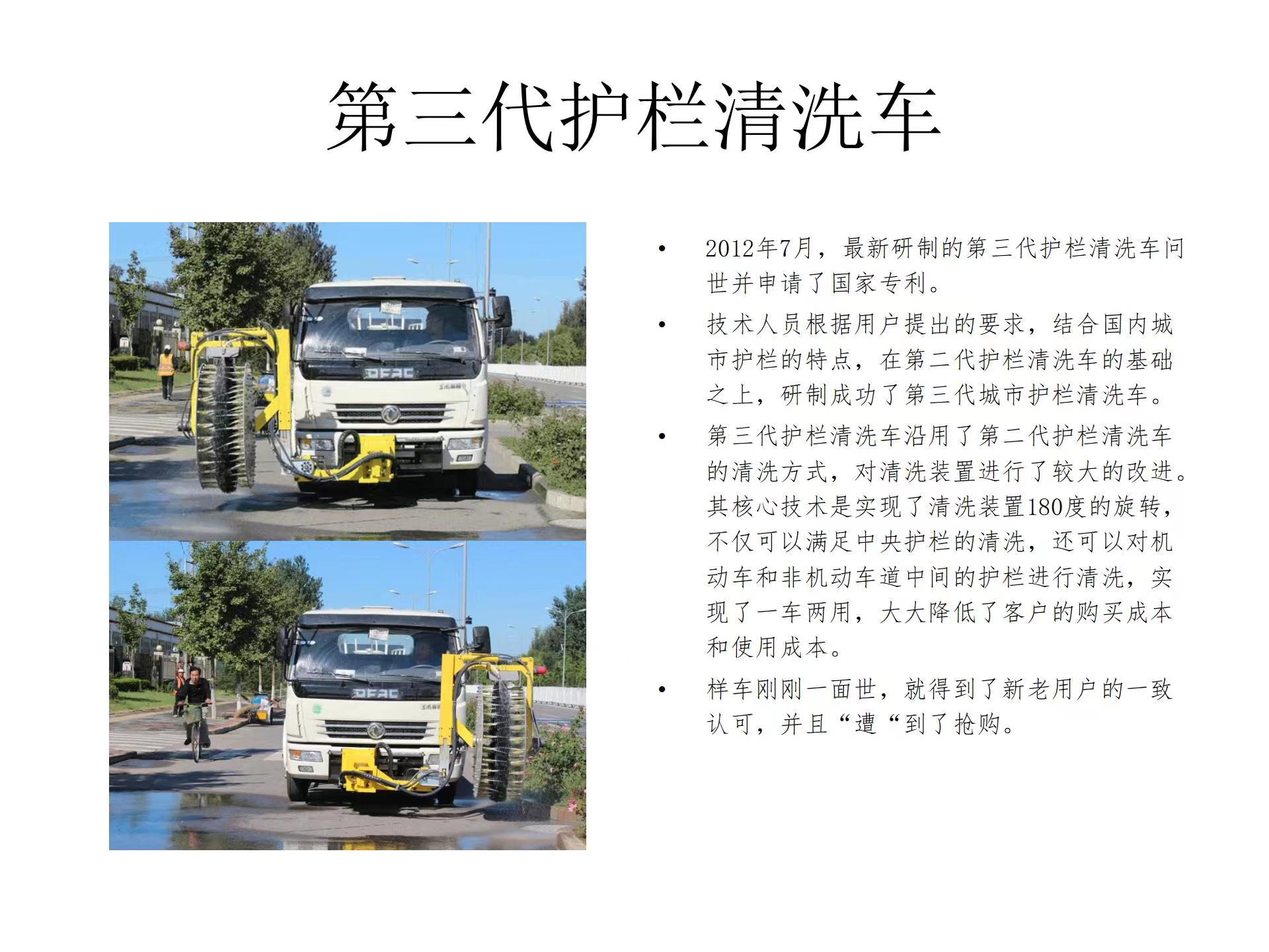 科普篇:城市护栏清洗车的演变 作为国内城市护栏清洗车的首创,北京泽通自1998年至2012年经过十余年的征程,完成、完善了第三代城市护栏清洗车的研发和生产。第三代城市护栏清洗车的研发成功,极大地受惠于广大的用户,不仅水的荷载量出奇的大,同时还具备洒水车的全部功能。盘形清洗刷的设计,使清洗洁净度更高,无付发动机设计有效地节约用户使用成本,刷体前置设计实现了机、非护栏的左右清洗。一系列的不断改造与完善,成为这个产品国内的领跑者。